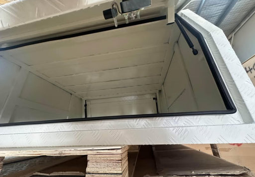 Brand new product Material: Checker Plate Size: 1400mm x 1800mm x 860mm - 2 door 1800mm roof rack Powdercoated white (Tray not included) Show ro...